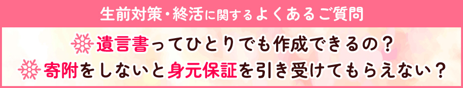 こうしたおひとり様には日常的な生活支援から施設入居や入院時に必要な身元保証人対応、ご逝去後の葬儀供養や様々な事務手続きなど、様々な支援が求められます。これらに備えるのが「おひとり様の終活」です。