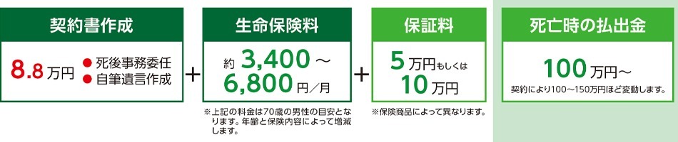 - 2 「既払込保険料」+「保証料5万円もしくは10万円」+「保証金最大35万円」が、死後事務にかかる費用の原資となります。