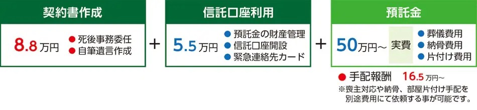 - 死後事務の内容と範囲によって死後事務報酬が変動いたします。個別説明にてご確認ください。
